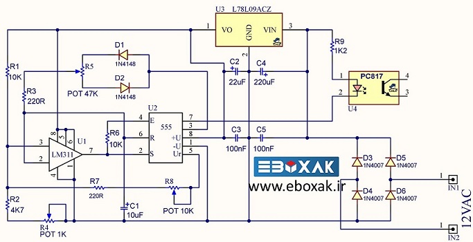 البته میشود یک مقاومت متغیر بین پایه 5 و زمین قرار داد و فرکانس را با آن تنظیم کرد، اما در این صورت میانگین ولتاژ برابر با نصف ولتاژ تغذیه نخواهد شد و این به نوبه خود منجر به تغییر در دیوتیسایکل، هنگام تنظیم فرکانس میشود. مشکل با وارد کردن یک مقایسهکننده اضافی به مدار حل شده است. من از LM311 استفاده کردم، اگرچه میتوان از دیگر تقویتکنندههای عملیاتی معمول نیز به جای آن استفاده کرد. از مقاومت متغیر R8 برای تنظیم فرکانس و R5 برای دیوتی سایکل استفاده شده. مقاومت R4 برای متعادل کردن ولتاژ مرجع مقایسهکنندهها مورد نیاز هست. مقاومت متغیرها باید به گونهای تنظیم بشوند تا وقتی دیوتیسایکل از حداقل به حداکثر تغییر میکند، فرکانس بدون تغییر باقی بماند. با مقادیر اجزای نشان داده شده در شماتیک، فرکانس تولیدی تقریباً از 15 تا 500 هرتز قابل تنظیم هست.