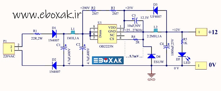 به دلیل اینکه در جستجوهای وبی، نمونه شماتیک کاربردی به جز دیتاشیت پیدا نکردم. برای آزمون شرایط سخت، و سنجش صحت کارکرد و مقادیر المانهای اطراف OB2225N، تا حد مرگ به این آی-سی تنش وارد کردم.
