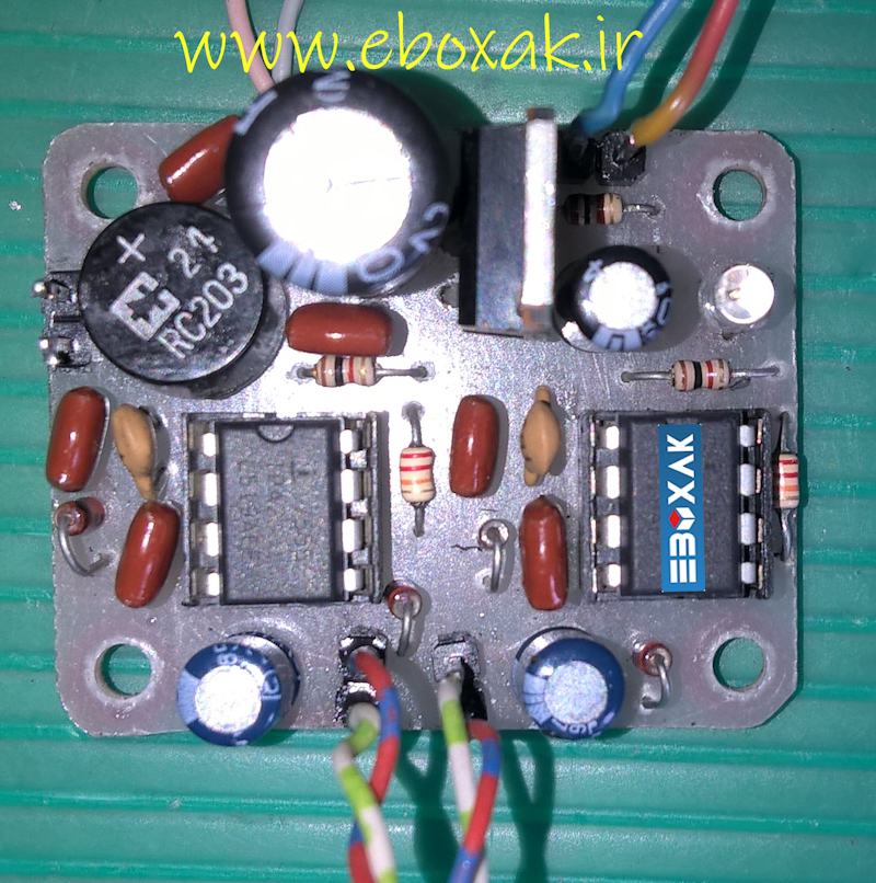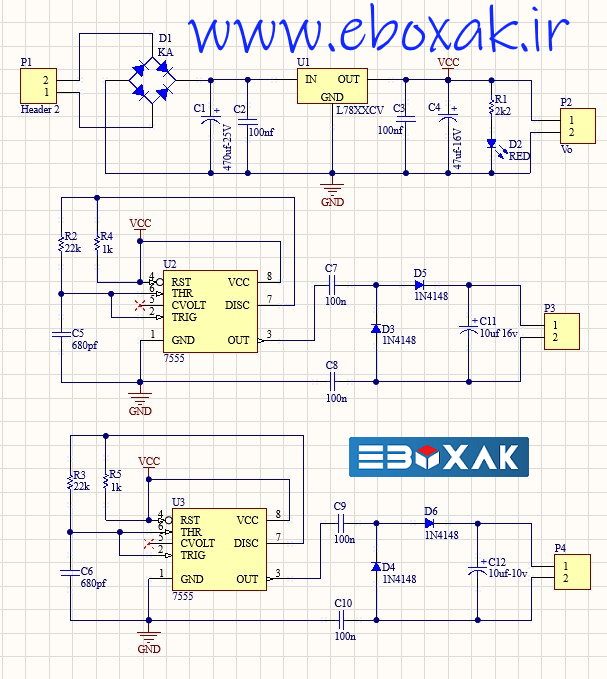 این آی سی تایمر همه جا حاضر، TLC555، LMC555 یا 7555 است که در پیکربندی مولتی ویبراتور، یک موج مربعی 70 کیلوهرتز را تولید میکند که به یک یکسوساز ساده اعمال میشود. در اصل، خازن های C7 و C8 ایزوله الکتریکی ذکر شده در بالا را بین ریلهای تغذیه PSU و ماژول LCD ایجاد میکنند. آی سی قدیمی NE555 نباید در اینجا استفاده شود، زیرا بارهای بسیار زیادی را روی ولتاژ منبع تغذیه خود مبدل وارد میکند. بسته به نوع کیفی و برند CMOS 555 که استفاده میکنید، مقاومتها ممکن است برای اطمینان از ولتاژ تغذیه حدود 10 ولت در پایههای 8 و 4 تراشه، کمی تصحیح لازم داشته باشند. در ولتاژ خروجی 9.5 ولت، حداکثر جریان خروجی مبدل حدود 1 میلی آمپر است.